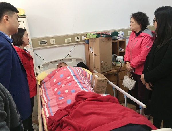 11月20日,在宜川街道黨建中心和華陰居委會領(lǐng)導(dǎo)的帶領(lǐng)下,集團(tuán)青年代表們前往老人住處,送上料理機(jī)和水果的同時也帶去了集團(tuán)黨團(tuán)青年們誠摯的問候與祝福,鼓勵他配合治療,堅持康復(fù)訓(xùn)練,相信不久的將來一定可以重新站起來。病床上的鐘叔叔雖然不能說話,卻多次激動地留下眼淚。