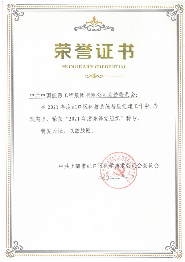 會議的最后,對虹口區(qū)科技系統(tǒng)基層黨建工作中表現(xiàn)突出的黨組織進行了表彰,中國能源工程集團有限公司系統(tǒng)黨委榮獲“2021年度先鋒黨組織”榮譽稱號。