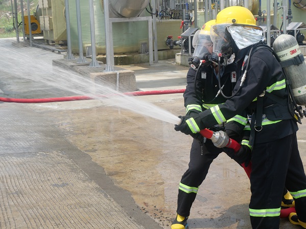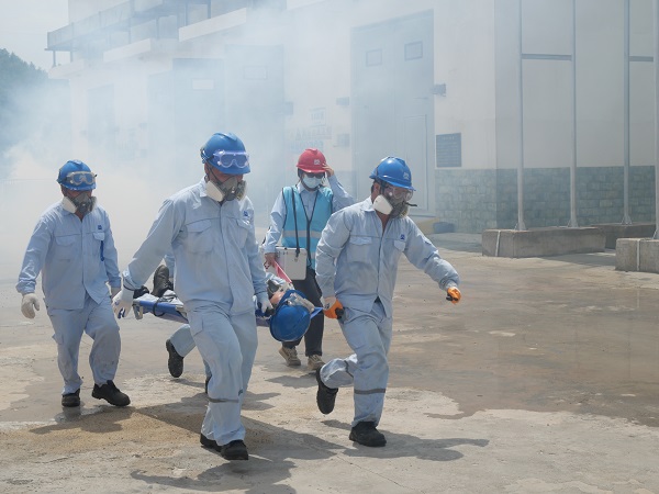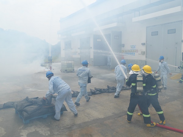 本次應(yīng)急演練模擬的場景是一名員工在操作叉車轉(zhuǎn)移廢有機溶劑時,因操作失誤,前叉猛烈撞擊3#暫存?zhèn)}庫大門,導(dǎo)致廢有機溶劑泄漏并引發(fā)火災(zāi),造成安全事故。演習(xí)中,在模擬事故發(fā)生后,中機茂名立刻啟動車間級響應(yīng),經(jīng)過車間組織緊急滅火救援后,火勢仍無法得到控制,且一名滅火員工因吸入有害氣體而出現(xiàn)頭暈、惡心等癥狀,隨即啟動公司級響應(yīng),各應(yīng)急救援小組緊急集合并配合搶險救援,最終順利完成滅火和救援任務(wù)。