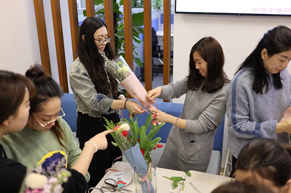 一早,公司為各崗位的女職工們準(zhǔn)備了一份“小禮物”。彩玫、康乃馨、香檳、相思梅、郁金香,各種花材供各位女神選擇與搭配,在送出祝福的同時(shí)讓大家把盎然的春意帶回家。